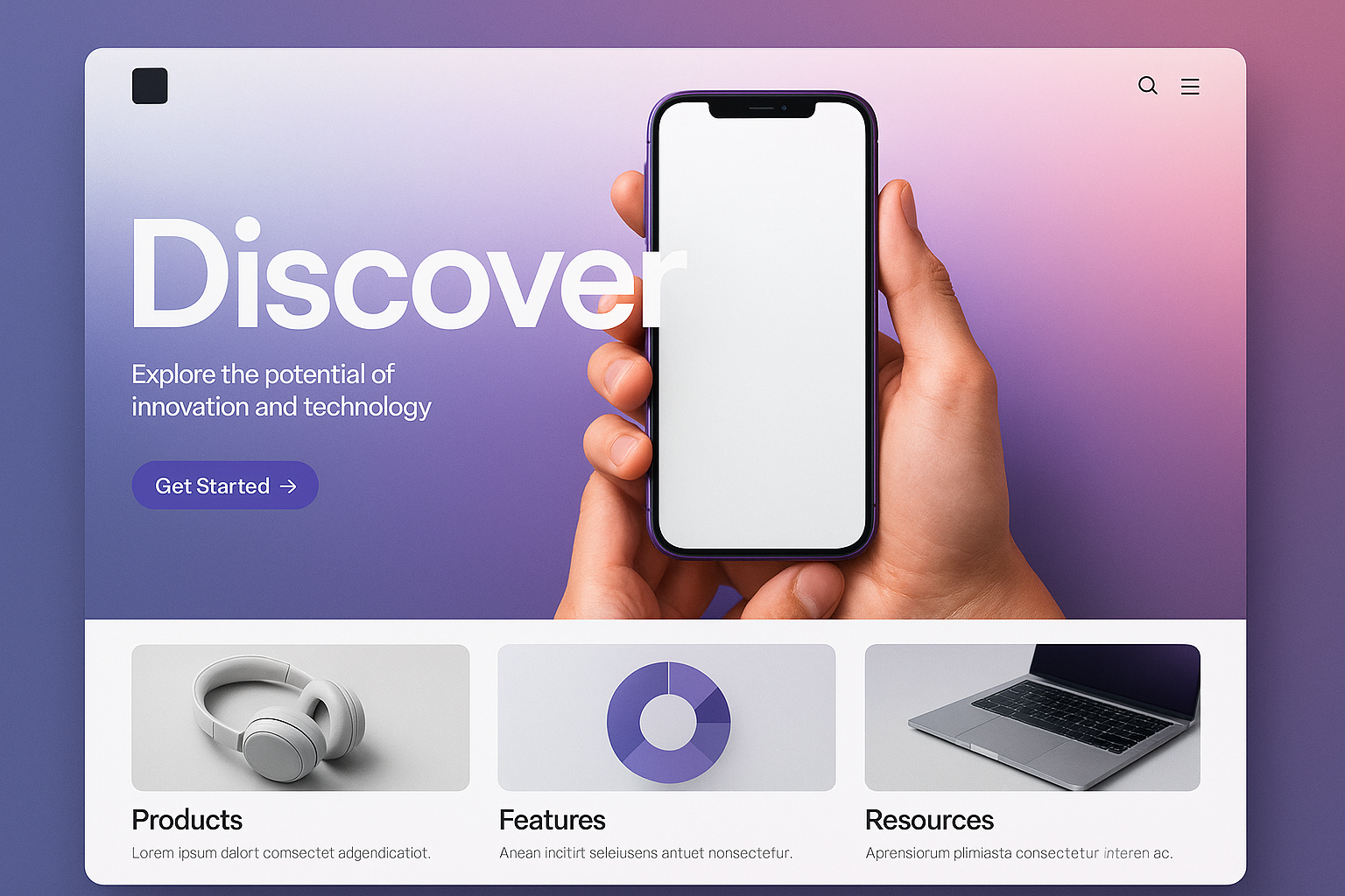 /Collection: /by davooda/Type: PNG/A sleek landing page design featuring a hand holding a phone with a white screen, bold typography, and a gradient background. Includes sections for products and features.