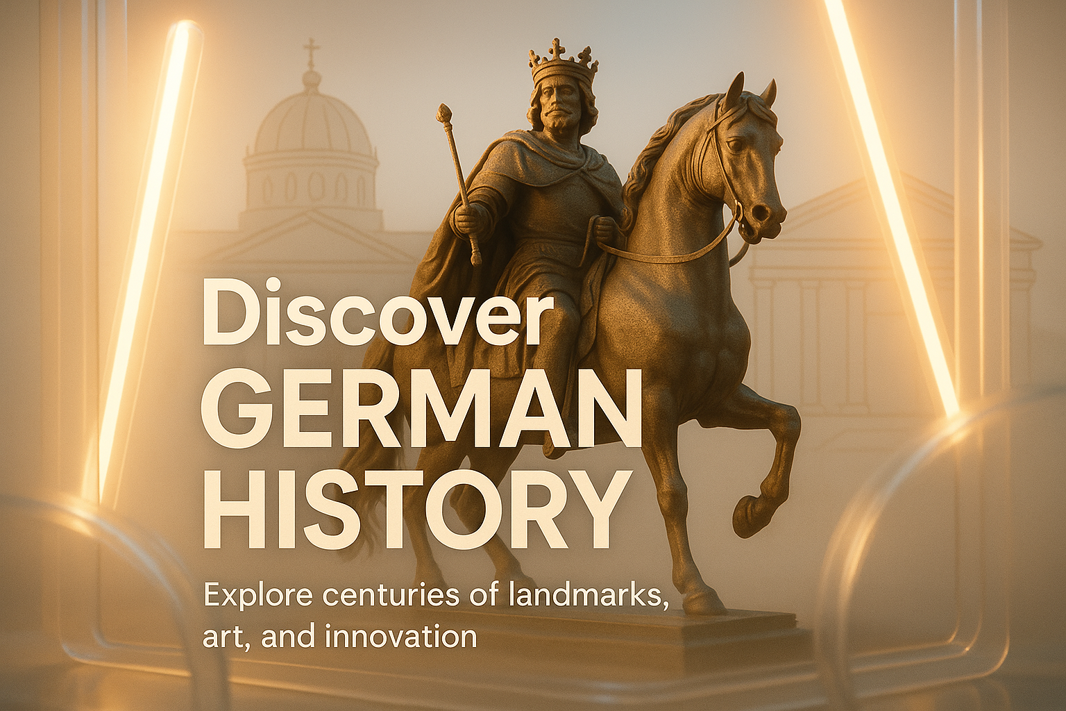 /Collection: /by davooda/Type: PNG/Engaging promotional image featuring a statue of a historical figure, highlighting German history with modern design elements. Ideal for cultural and educational campaigns.