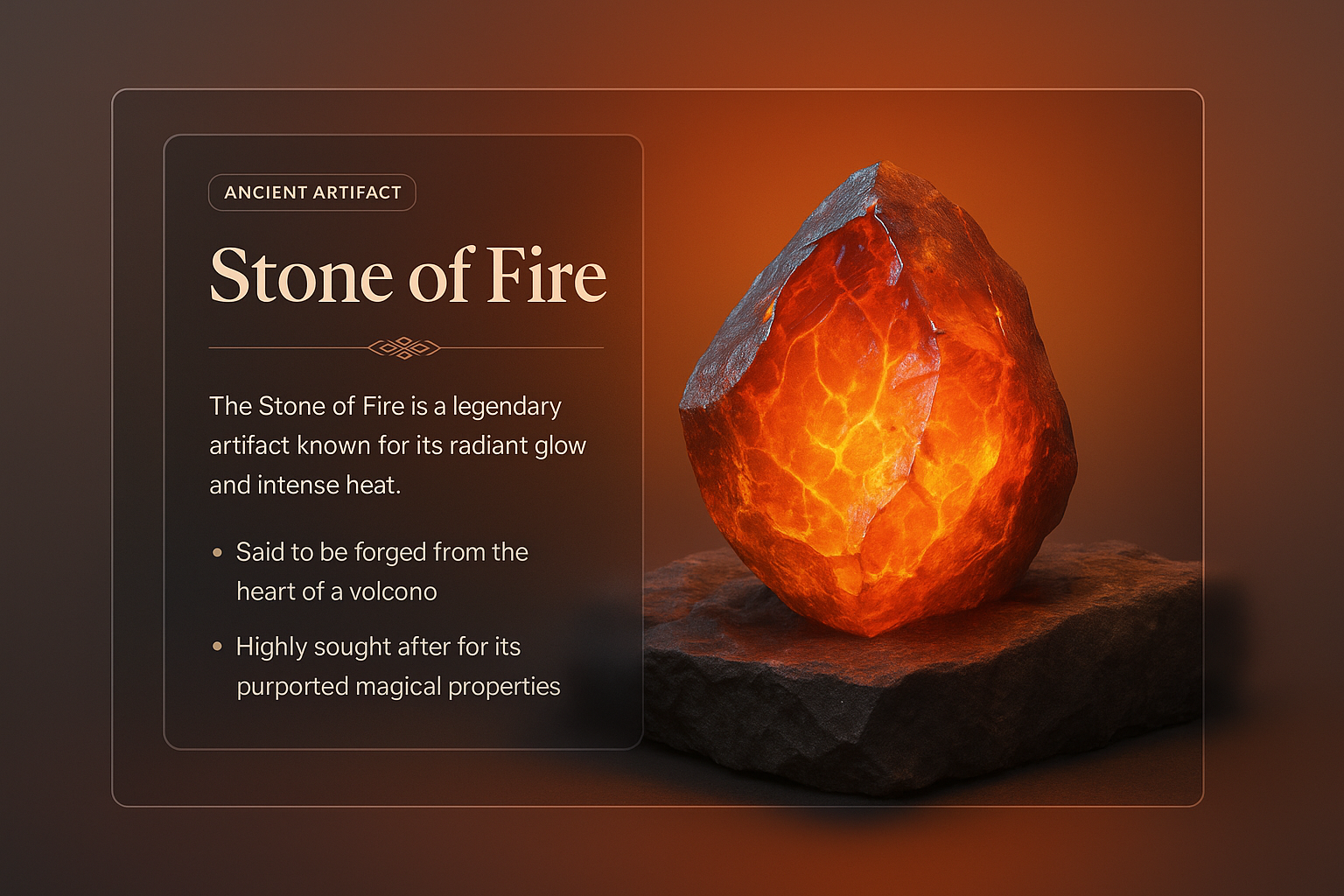 The image features a glowing Stone of Fire, radiating warm light against a gradient background. It is presented on a textured rock, highlighting its mystical properties.