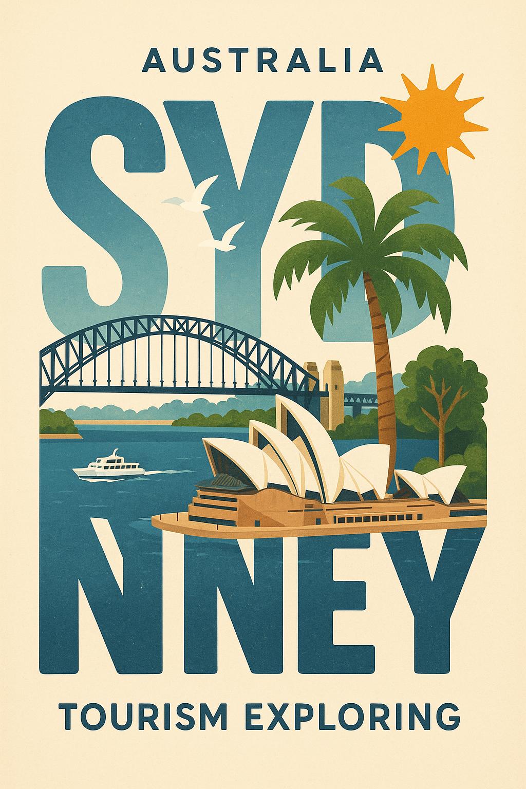 Stylized Travel Poster Featuring Sydney and Iconic Landmarks