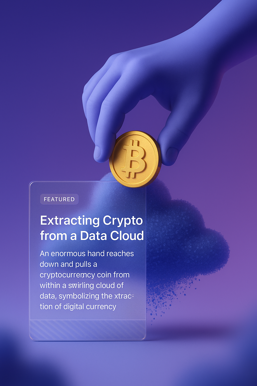 /Collection: /by davooda/Type: PNG/A large hand reaches into a swirling data cloud to pull out a cryptocurrency coin, symbolizing digital currency extraction. The design features a sleek, modern interface with layered elements.