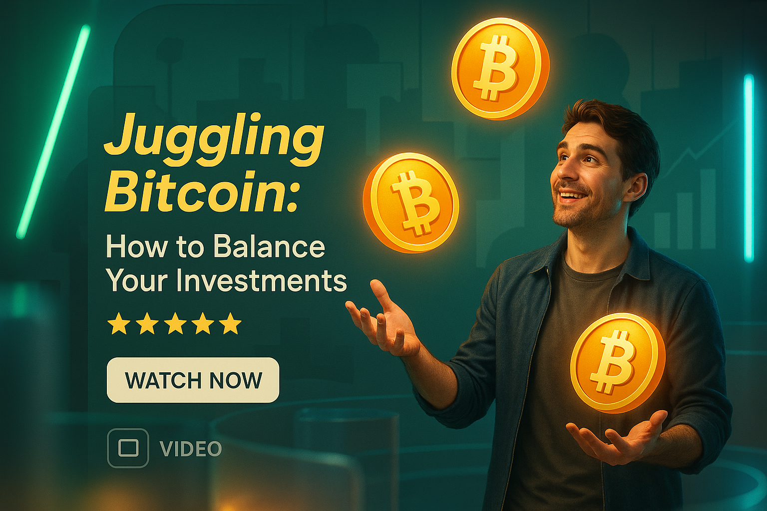 /Collection: /by davooda/Type: PNG/Dynamic video thumbnail featuring a man juggling Bitcoin symbols, designed to attract viewers interested in cryptocurrency investment strategies. The modern style and vibrant colors enhance engagement.