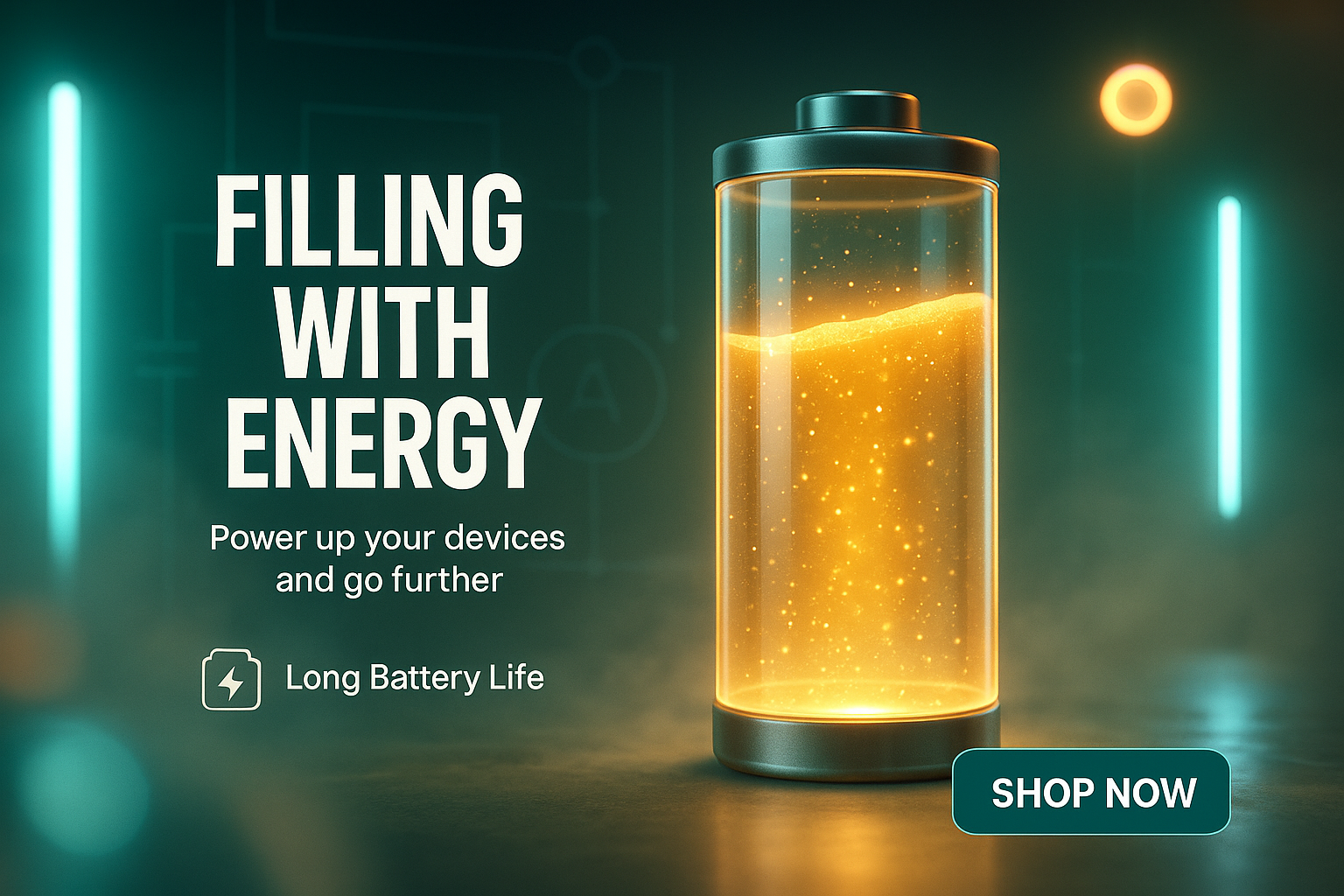 Engaging promotional banner showcasing a glowing battery concept, emphasizing energy and longevity, ideal for tech product marketing.