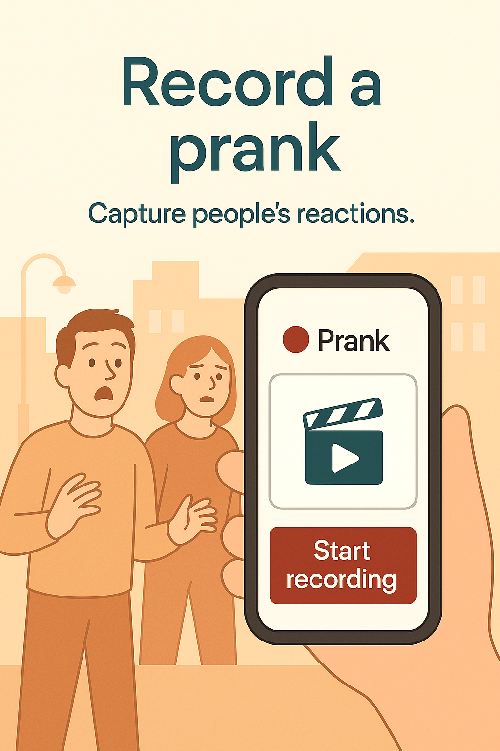 Illustrative graphic showcasing a prank recording app, emphasizing user engagement and reaction capture. The design features a hand holding a smartphone with a playful, modern aesthetic.