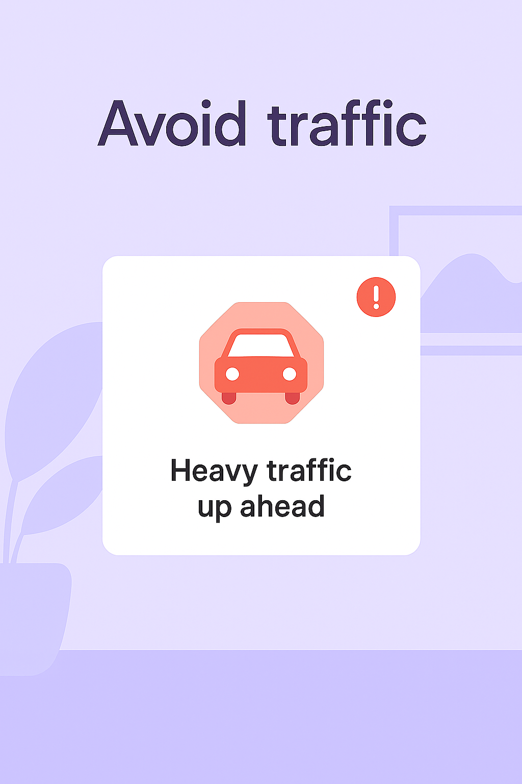 Informative traffic alert graphic featuring a car icon and warning message. Designed for use in navigation apps or transportation-related content.