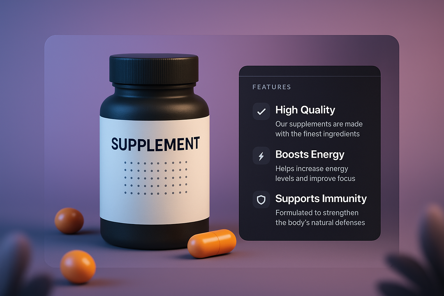 /Collection: /by davooda/Type: PNG/A visually appealing 3D illustration showcasing a supplement bottle with features highlighted in a dark label. The background features a smooth gradient, adding depth to the composition.