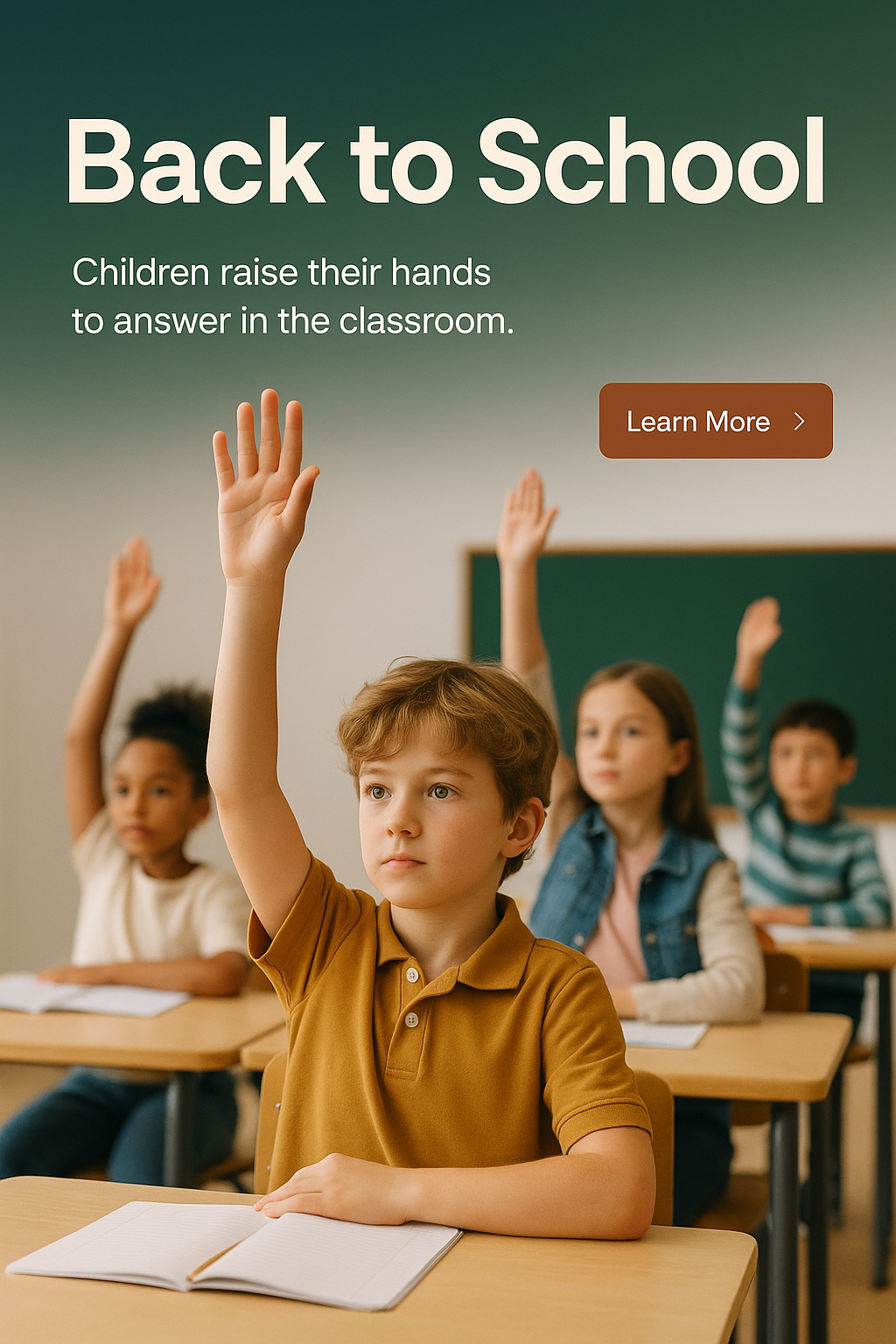 /Collection: /by davooda/Type: PNG/A classroom scene showcasing children raising their hands to answer questions, symbolizing engagement in learning. The backdrop features a gradient with a focus on a child in the foreground.