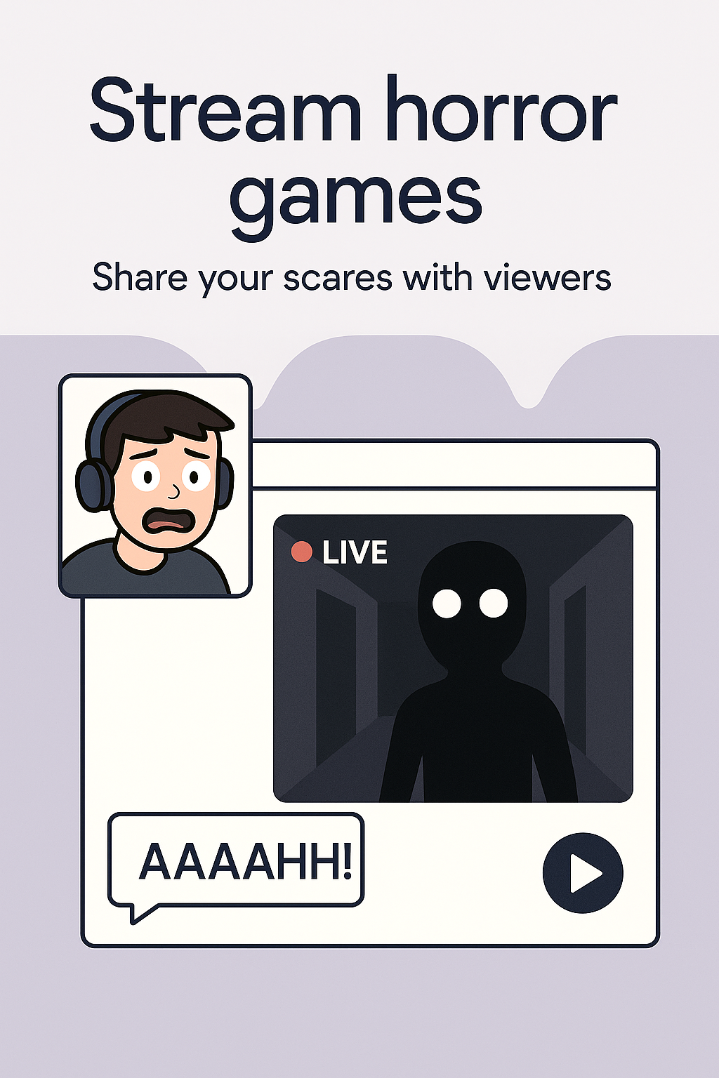 /Collection: /by davooda/Type: PNG/A visually striking social media graphic promoting horror game streaming, featuring an animated character expressing fear and a dark gaming scene, ideal for attracting viewers.