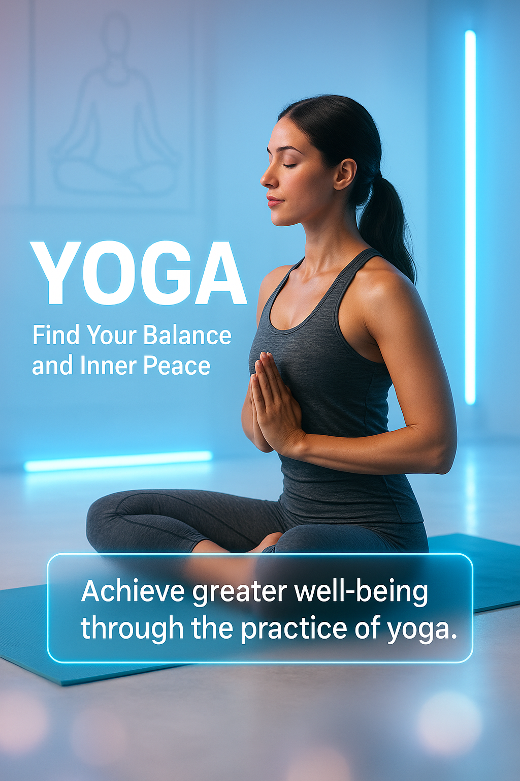 Engaging promotional image for yoga, showcasing a serene practitioner in a meditative pose. The calming blue lighting and modern design create a peaceful atmosphere, ideal for wellness and fitness marketing.