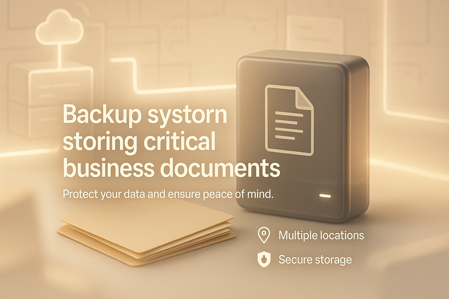 A modern graphic illustrating a digital backup system designed for secure storage of critical business documents, emphasizing data protection and peace of mind.