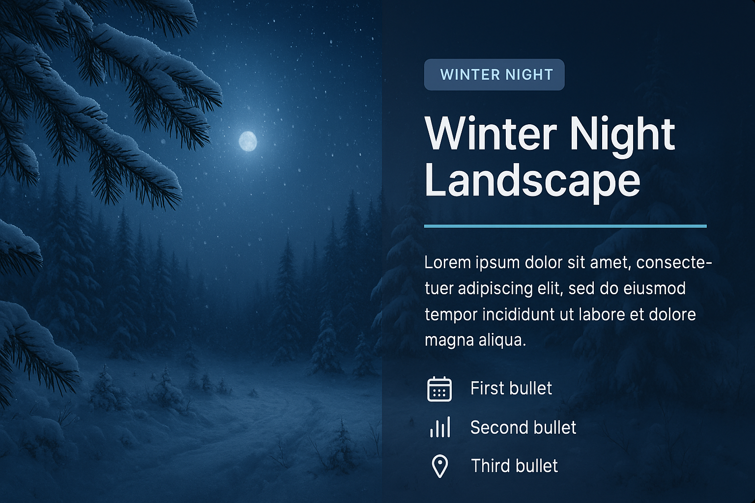 A tranquil winter night landscape featuring a moonlit scene with snow-covered trees, designed for presentations or seasonal promotions. The cool color palette evokes a peaceful atmosphere.