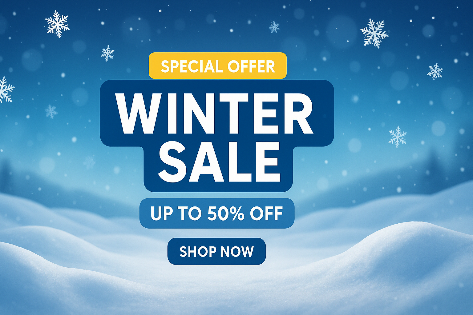 Vibrant promotional banner for a winter sale, featuring snowflakes and a cool color palette. Ideal for e-commerce marketing and seasonal promotions.