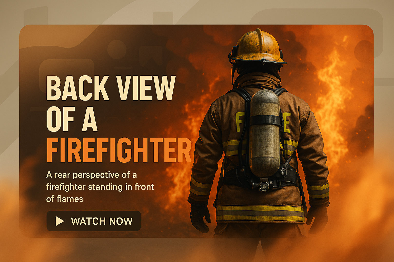 /Collection: /by davooda/Type: PNG/Powerful image of a firefighter viewed from behind, set against a backdrop of flames, symbolizing bravery and resilience. Ideal for safety campaigns or emergency services promotion.