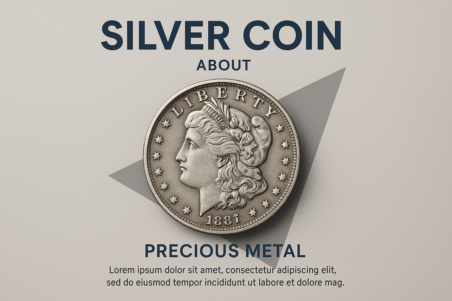 /Collection: /by davooda/Type: PNG/A visually appealing representation of a silver coin with a layered composition, featuring a geometric background and informative text elements about precious metals.