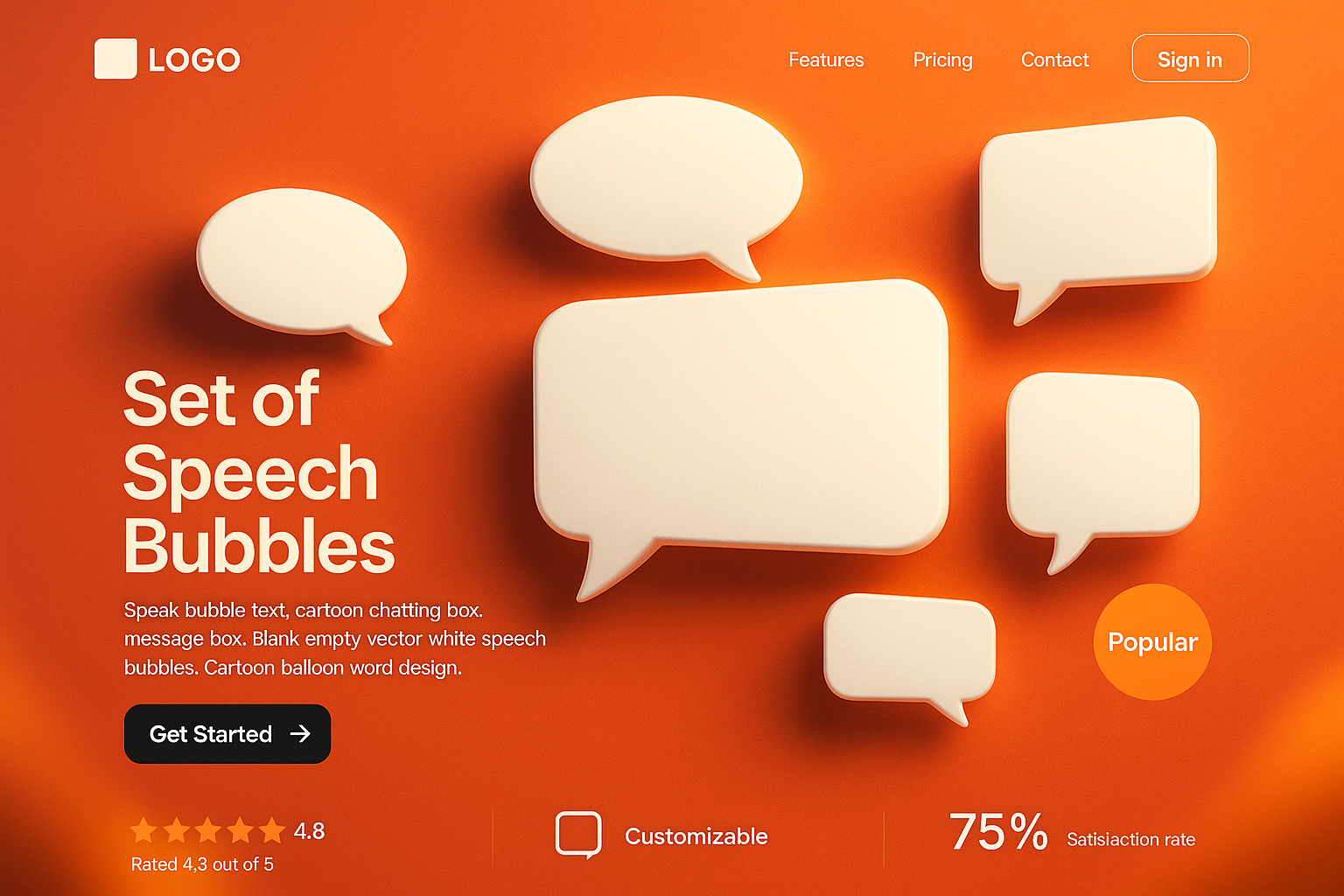 A modern landing page layout featuring a bold orange background, customizable speech bubbles, and a clear action button. Highlights include a satisfaction rate and star rating.