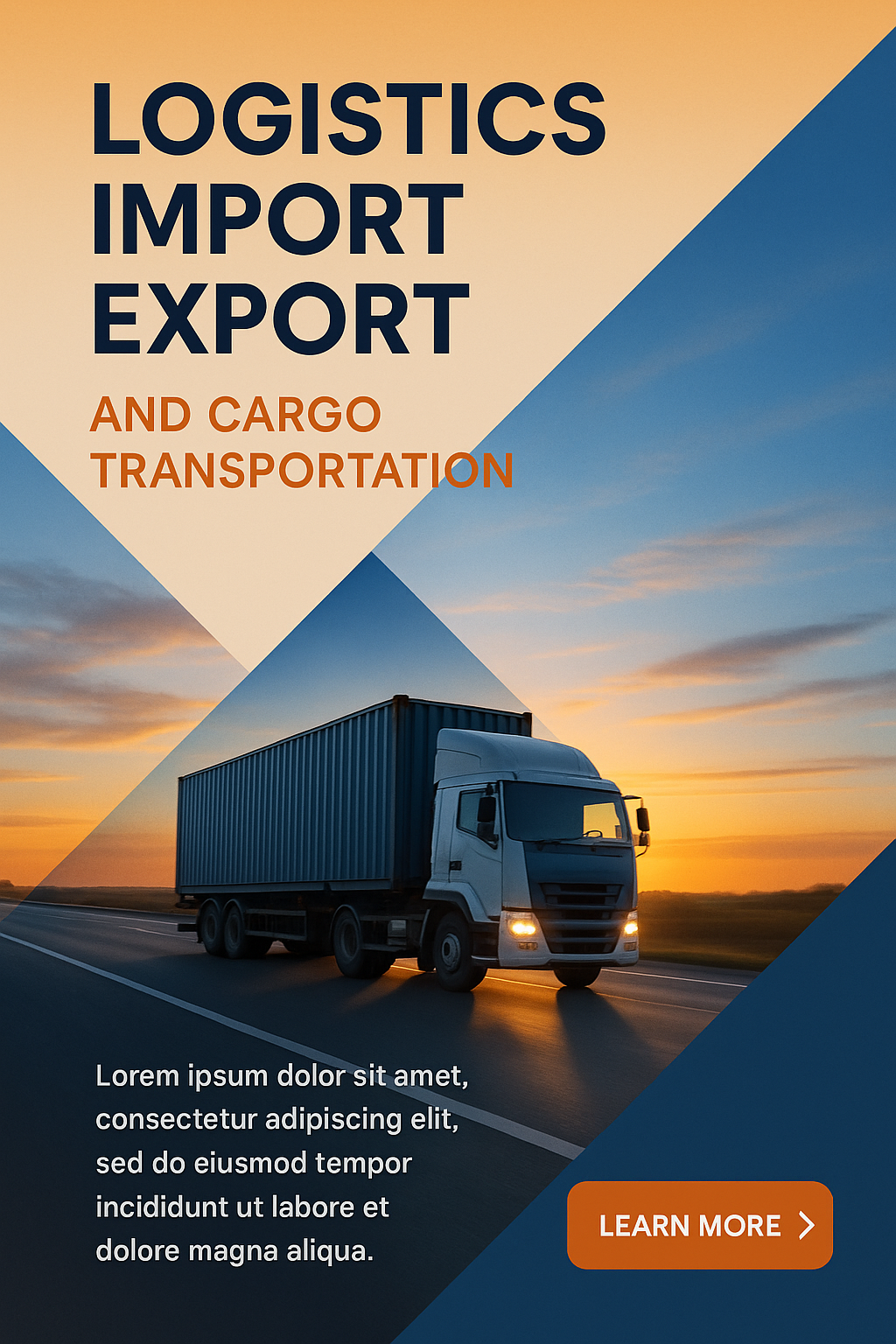 /Collection: /by davooda/Type: PNG/A container truck drives on a highway at sunset, with a blue sky in the background. The image features a layered composition with geometric shapes and a modern design, emphasizing the logistics and transportation theme.