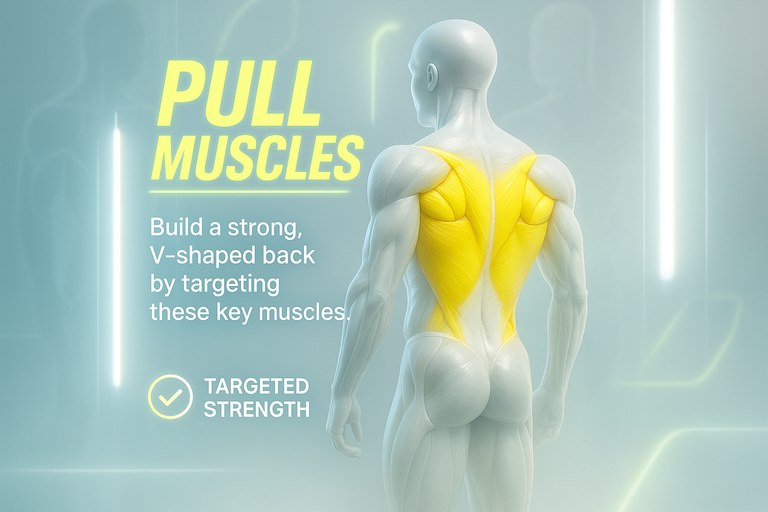 /Collection: /by davooda/Type: PNG/Informative graphic illustrating key pull muscles targeted for strength training, featuring a 3D anatomical model with vibrant highlights. Ideal for fitness education and workout guides.