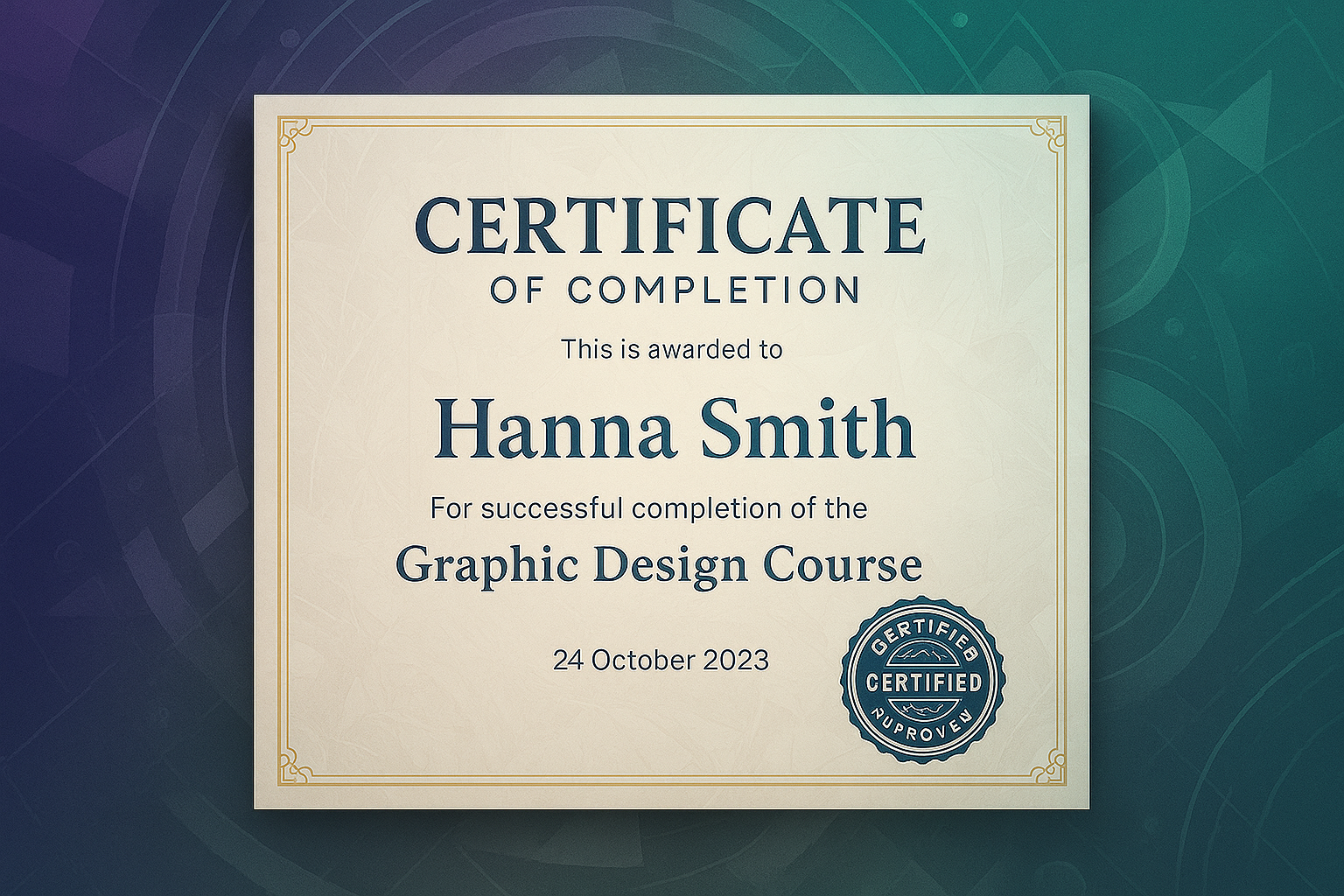 /Collection: /by davooda/Type: PNG/A formal certificate showcasing completion of a graphic design course, featuring elegant typography and a sophisticated layout, ideal for educational institutions.