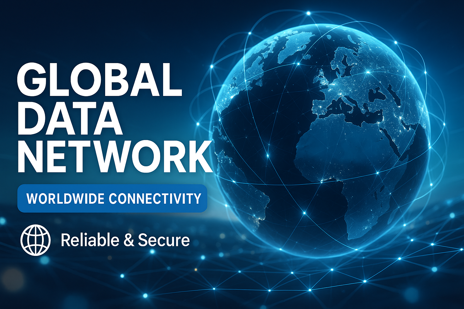 /Collection: /by davooda/Type: PNG/A modern digital graphic representing a global data network, showcasing worldwide connectivity with a glowing globe and network lines, ideal for tech-focused marketing materials.
