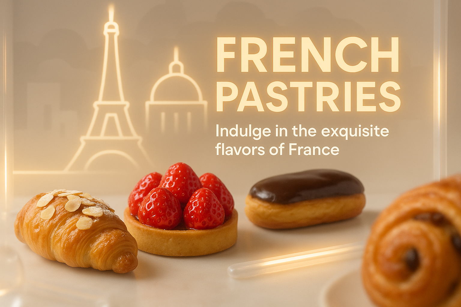 /Collection: /by davooda/Type: PNG/A visually appealing display of French pastries featuring a croissant, fruit tart, and eclair, set against a soft backdrop with iconic French landmarks. Ideal for culinary promotions and bakery marketing.