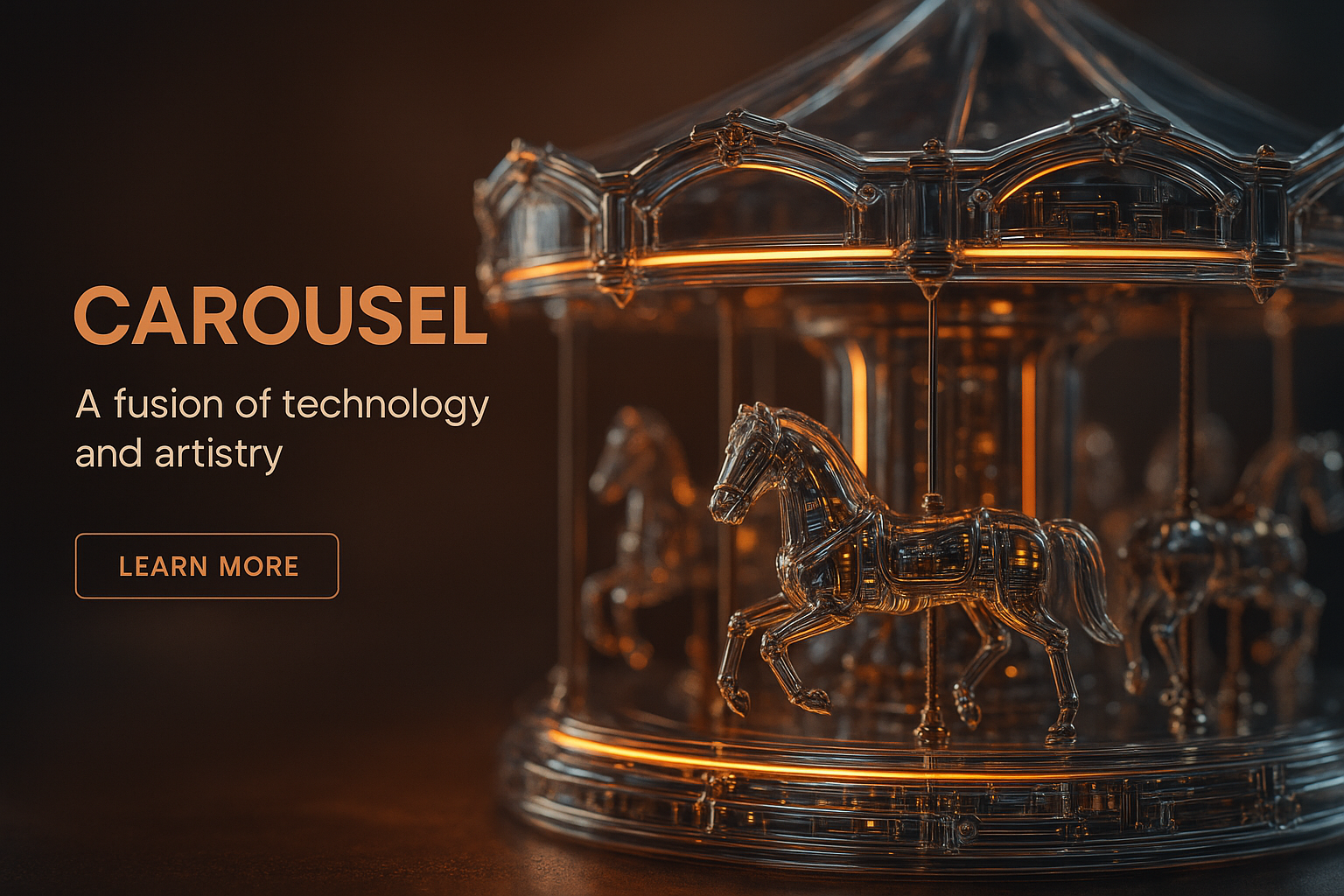 /Collection: /by davooda/Type: PNG/A hyperrealistic close-up of a futuristic carousel, crafted from glass-like polymers with glowing micro-LEDs. The elegant design features metallic components that reflect ambient light beautifully.