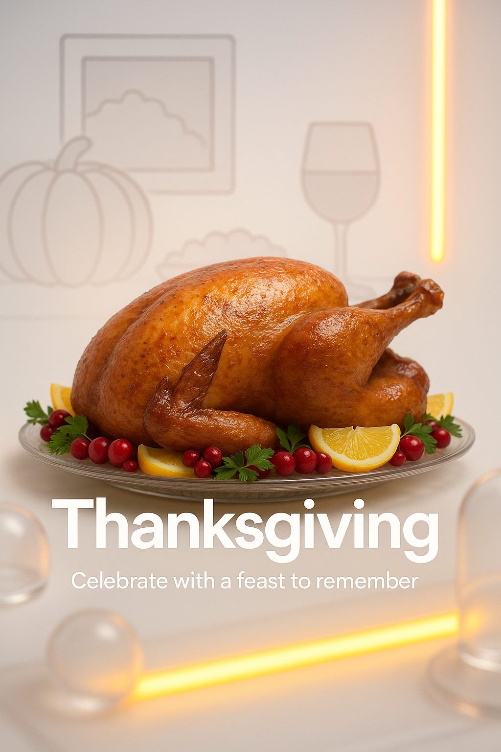 /Collection: /by davooda/Type: PNG/A beautifully styled image showcasing a roasted turkey on a platter, garnished with cranberries and lemon, perfect for celebrating Thanksgiving. The warm lighting creates a festive atmosphere, ideal for holiday promotions.