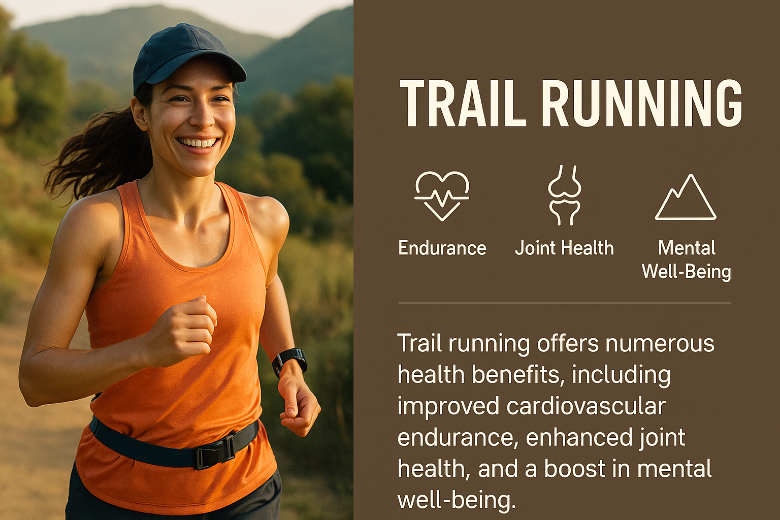A visually appealing graphic highlighting the health benefits of trail running, featuring a smiling runner and engaging icons. Ideal for fitness blogs or social media posts.