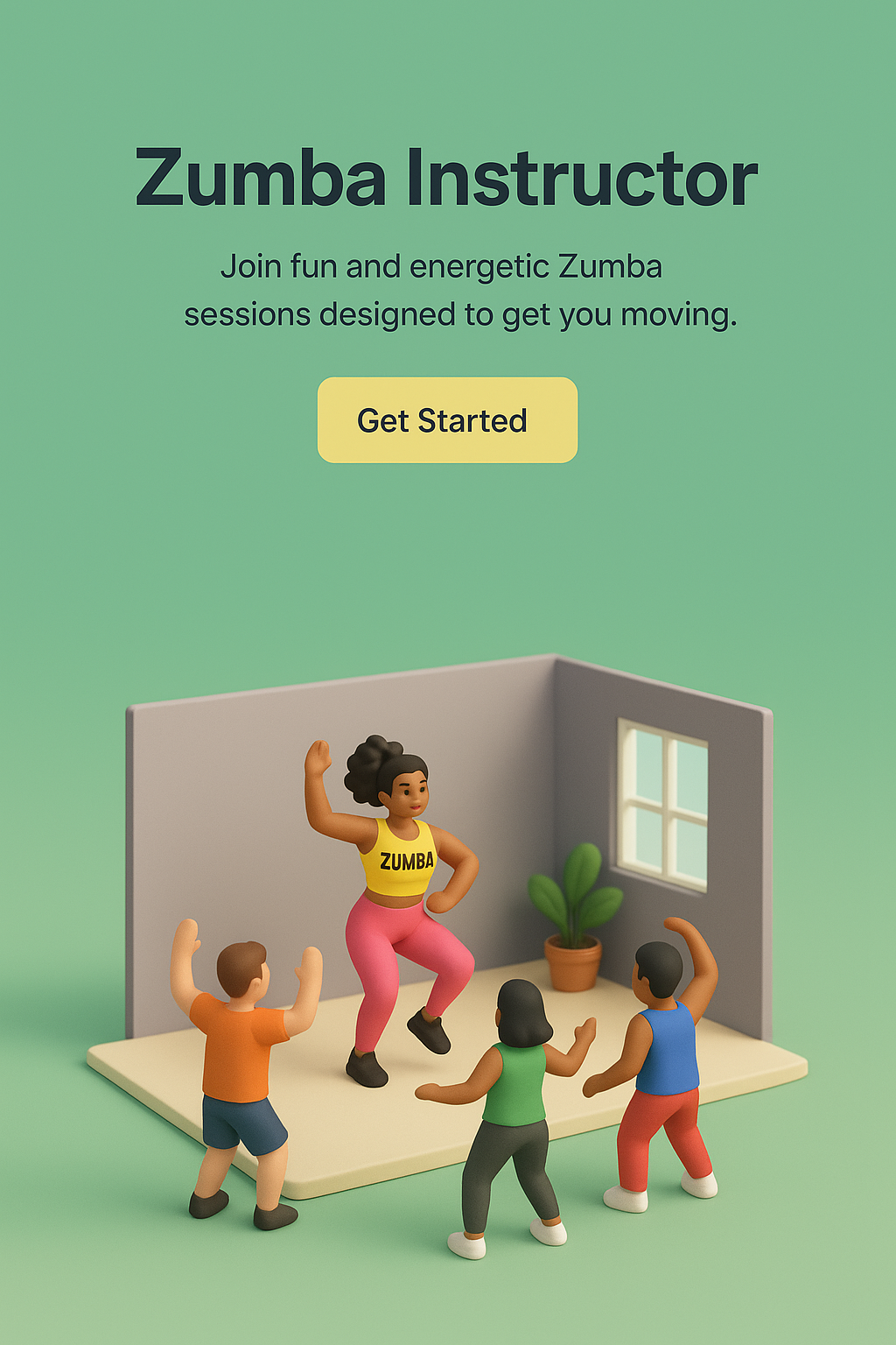 A vibrant 3D scene depicting a Zumba instructor leading a class. The background features a smooth gradient, creating a lively atmosphere. Participants are engaged and energetic.