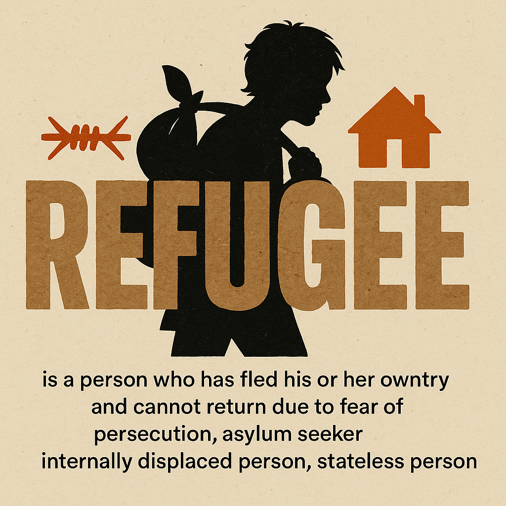 /Collection: /by davooda/Type: PNG/A visually striking graphic illustrating the concept of a refugee, featuring a silhouette and textual explanation, designed for educational purposes on social issues.