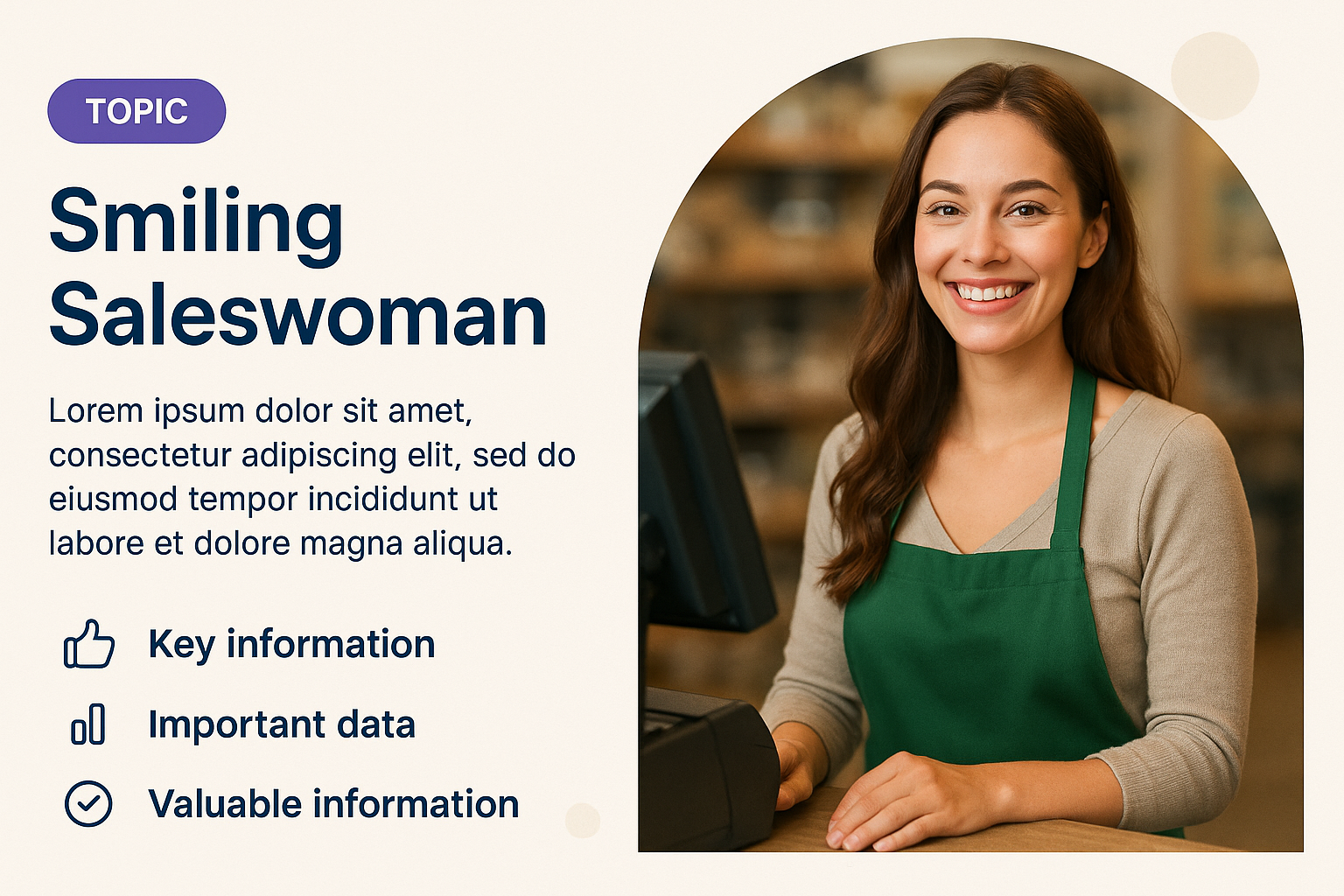 /Collection: /by davooda/Type: PNG/A warm and inviting professional portrait of a smiling saleswoman at a checkout counter, designed for business or marketing use. Ideal for promotional content.