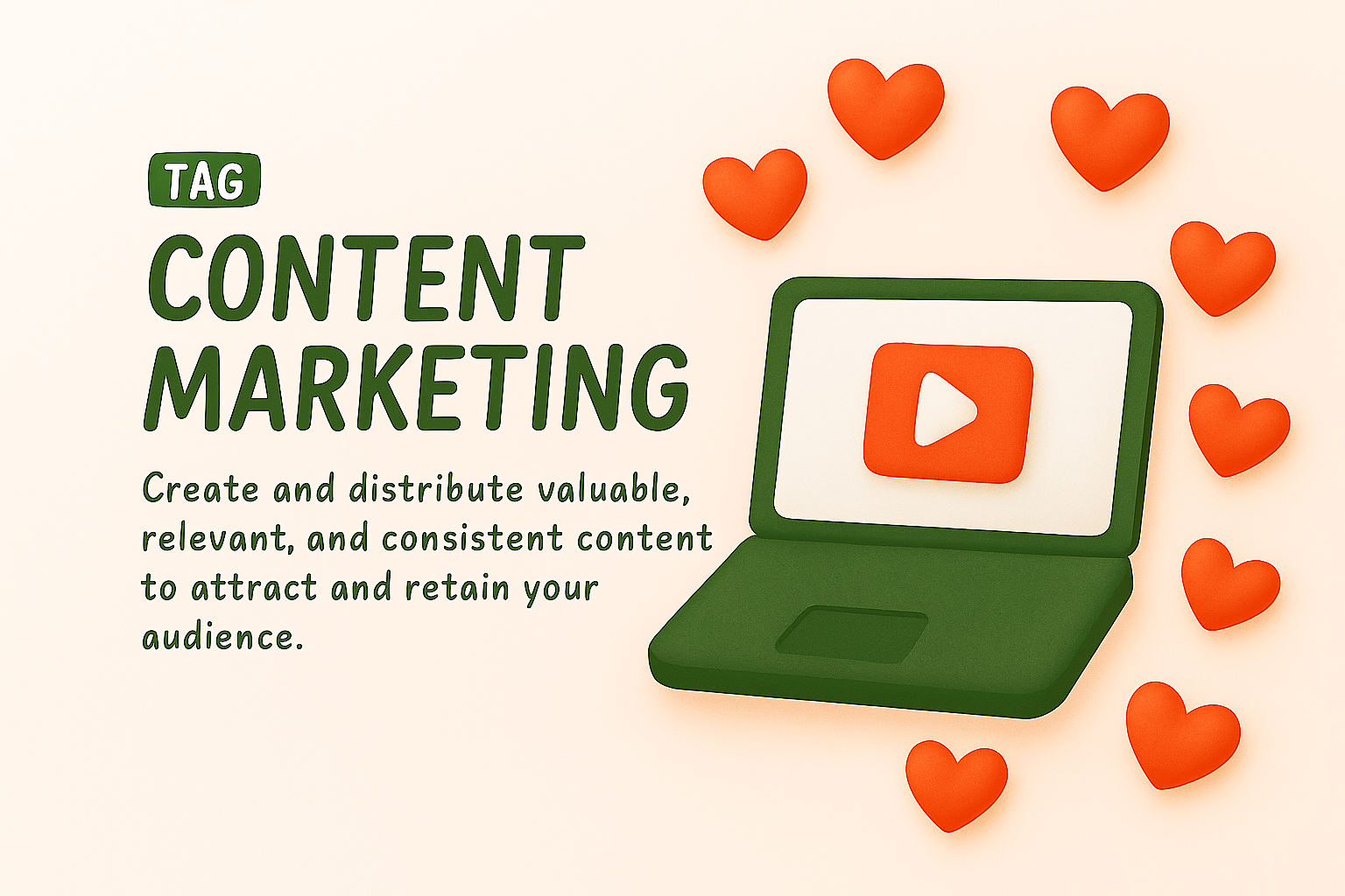 A vibrant 3D illustration depicting a laptop with a play button and hearts, representing the theme of content marketing. Ideal for digital marketing visuals.