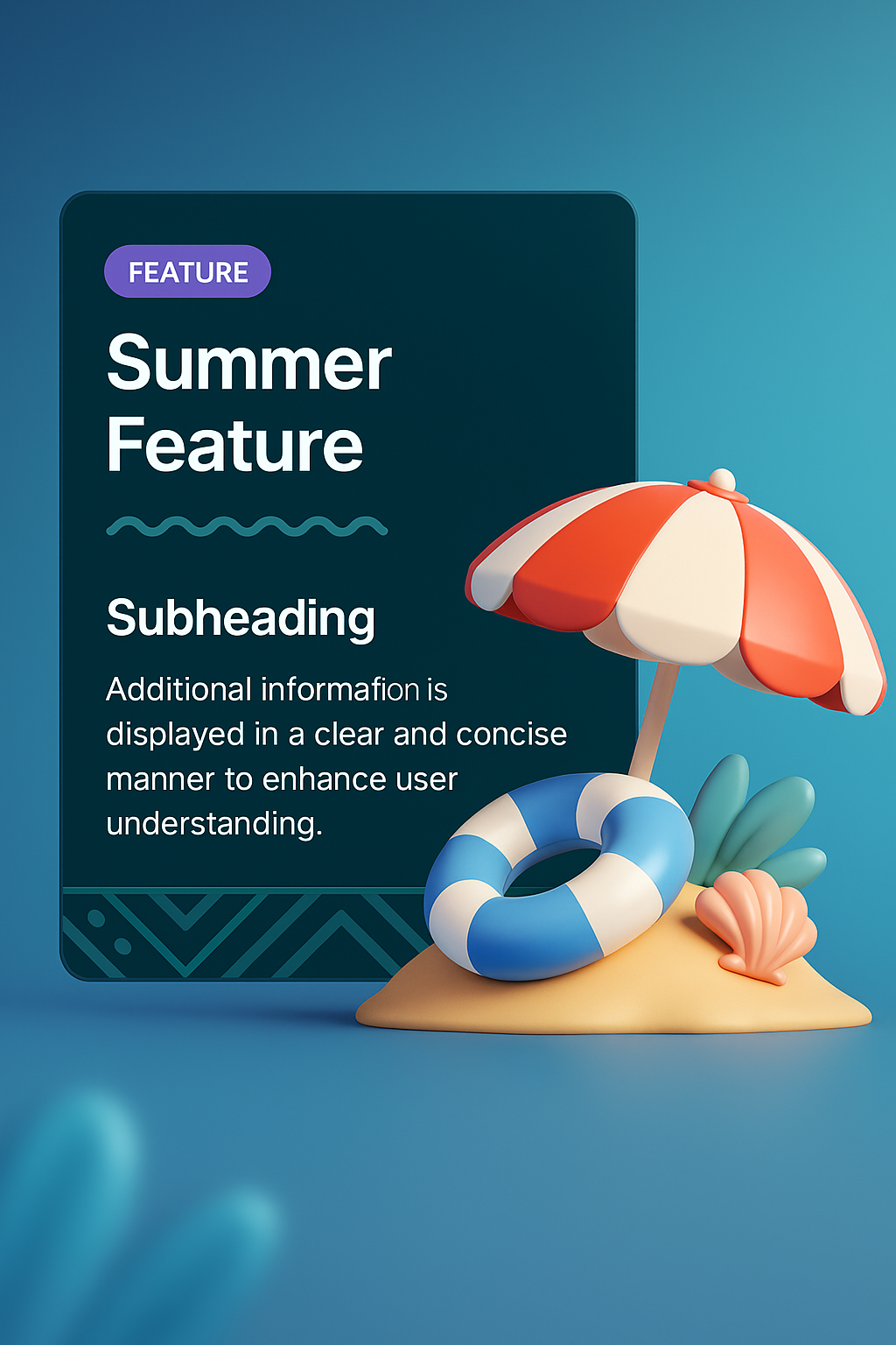 A vibrant 3D summer-themed icon featuring a beach umbrella, lifebuoy, and seashell. It displays a clear text layout for enhanced user understanding.