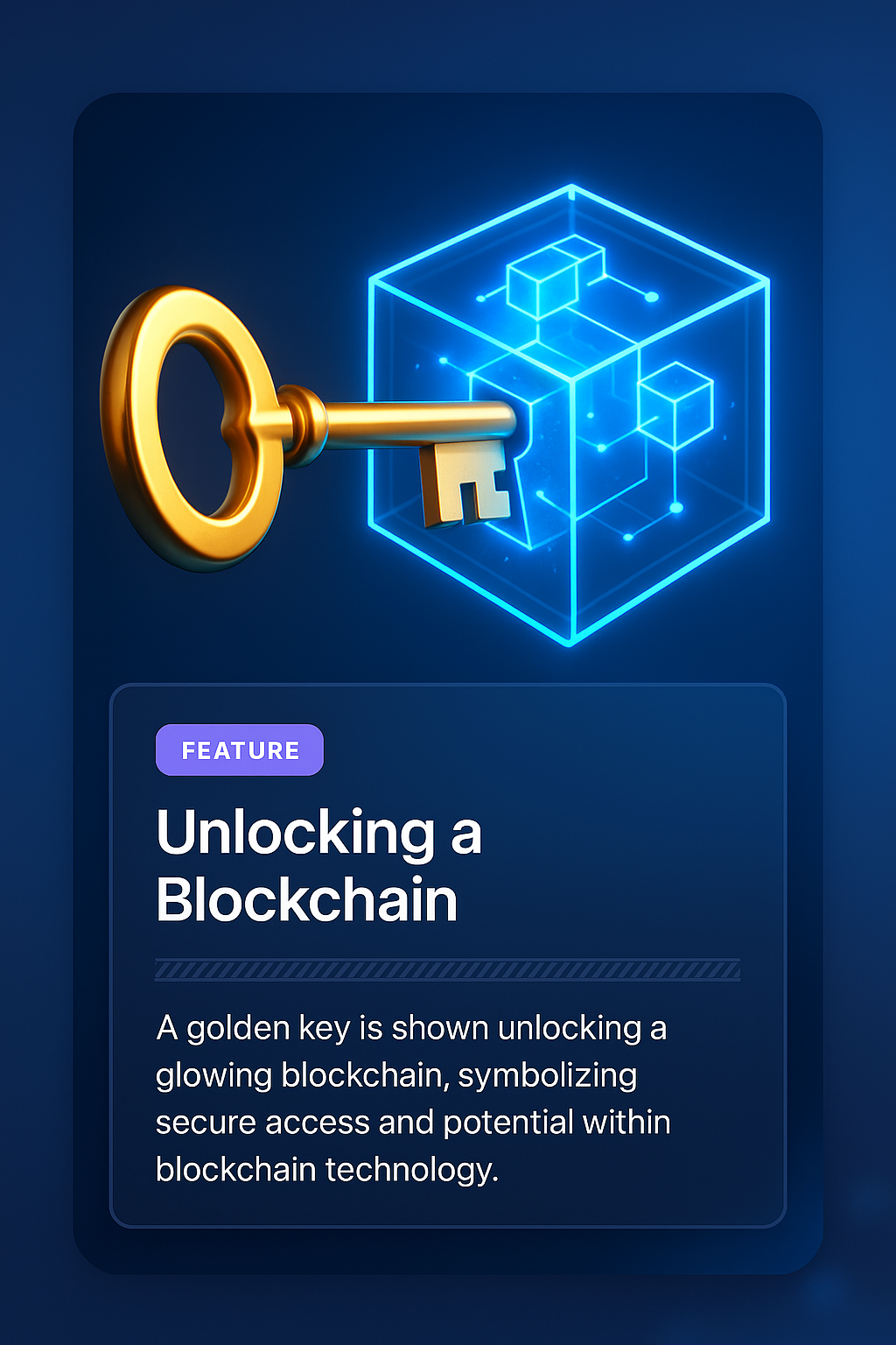 /Collection: /by davooda/Type: PNG/A striking image of a golden key unlocking a glowing blockchain cube, symbolizing secure access and potential in blockchain technology. The design is vibrant and modern.
