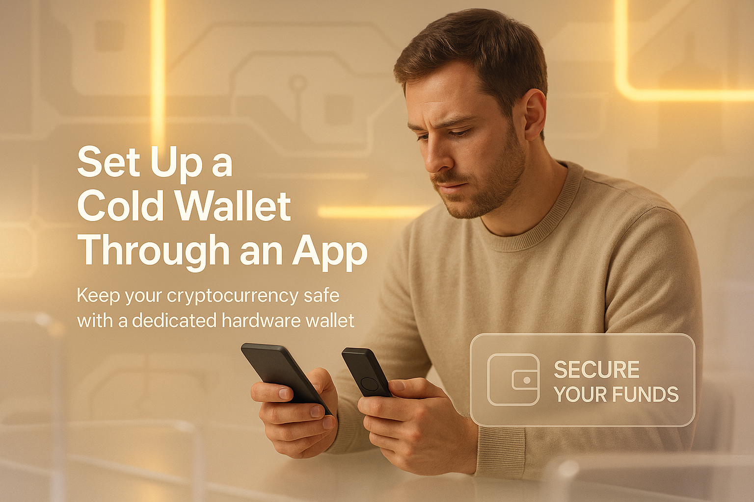 /Collection: /by davooda/Type: PNG/Informative promotional graphic depicting a user setting up a cold wallet through a mobile app, designed to enhance cryptocurrency security. Ideal for tech and finance audiences.
