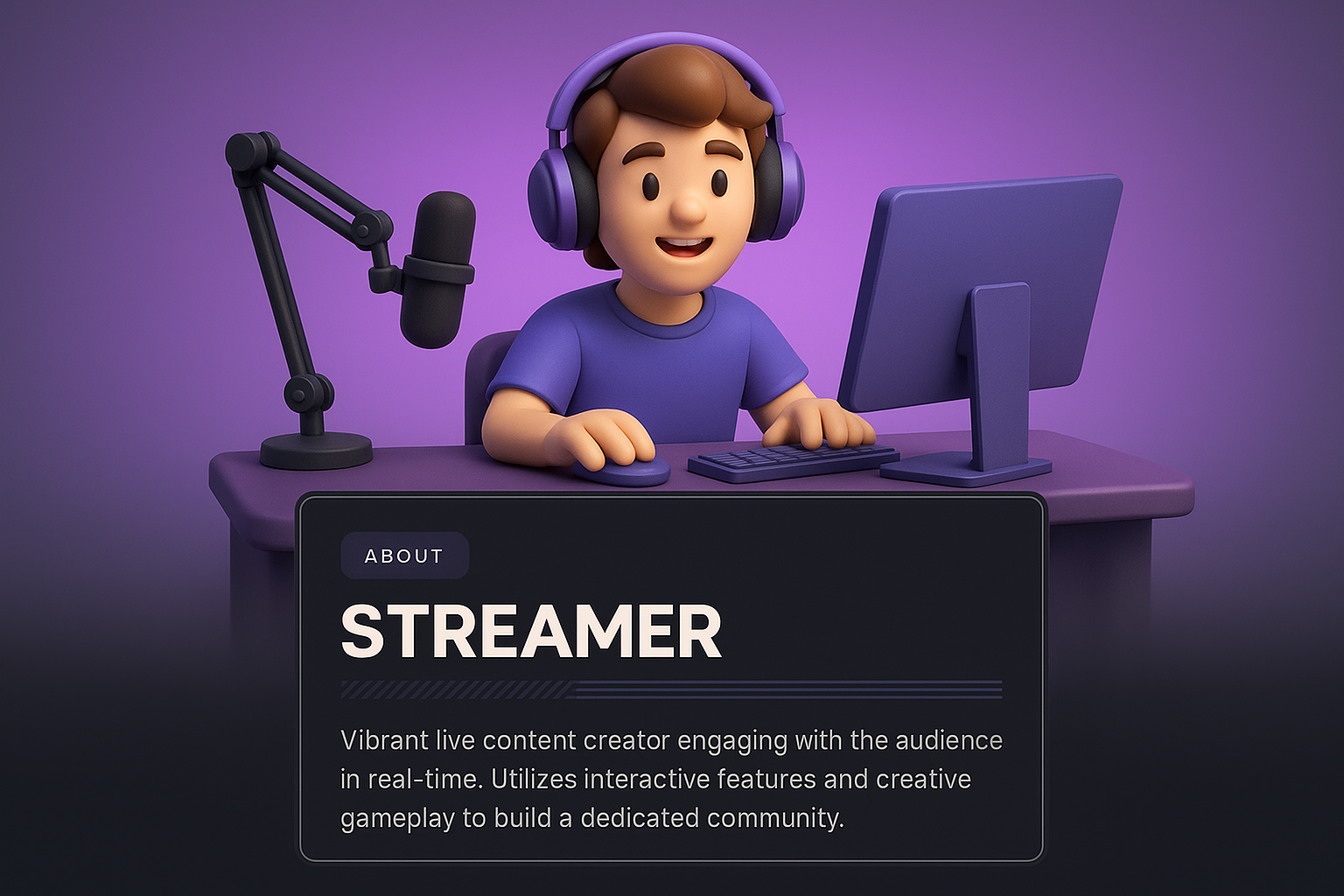 /Collection: /by davooda/Type: PNG/A vibrant 3D illustration featuring a streamer at a desk with a microphone and computer. The background transitions smoothly with a dark panel containing details about the streamer.