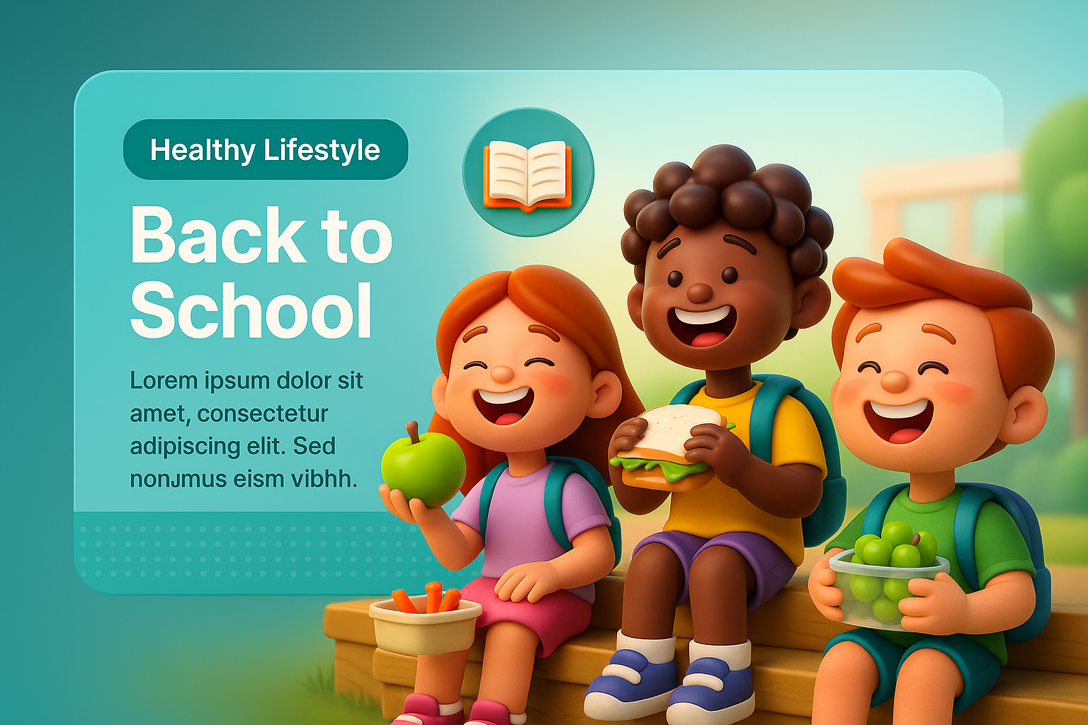 /Collection: /by davooda/Type: PNG/Three cheerful children sit on a bench, enjoying healthy food like apples, sandwiches, and salads. The background features a soft gradient, enhancing the back-to-school theme.