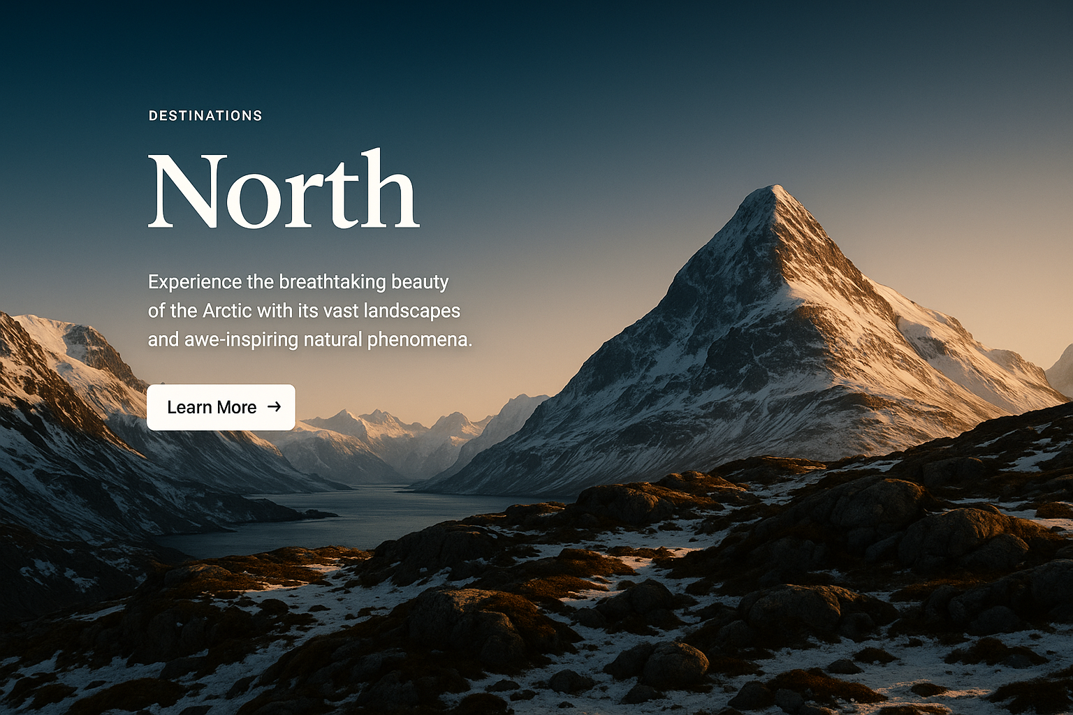 /Collection: /by davooda/Type: PNG/A beautifully crafted web page design showcasing the Arctic's majestic beauty. The layout includes a captivating image of mountains and a serene lake, with elegant typography and a call-to-action button.