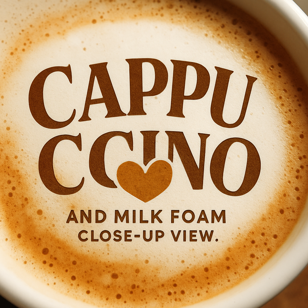 A visually appealing close-up image of a cappuccino showcasing intricate milk foam art and stylish typography, ideal for coffee-related content.