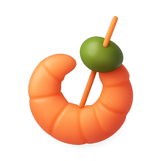 A 3D illustration of a stylized shrimp with an olive garnish, showcasing vibrant colors and a playful design. Ideal for food-related content or culinary promotions.