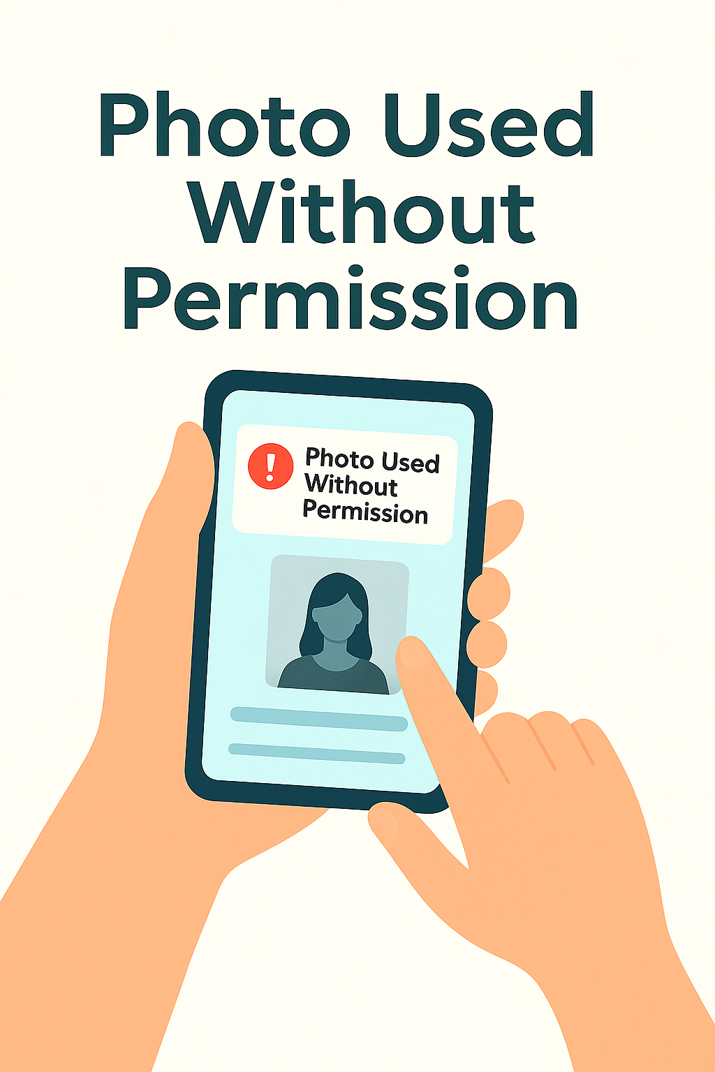 /Collection: /by davooda/Type: PNG/A digital illustration depicting a smartphone displaying an alert about unauthorized photo usage, featuring a hand interacting with the screen. Suitable for awareness campaigns on copyright issues.