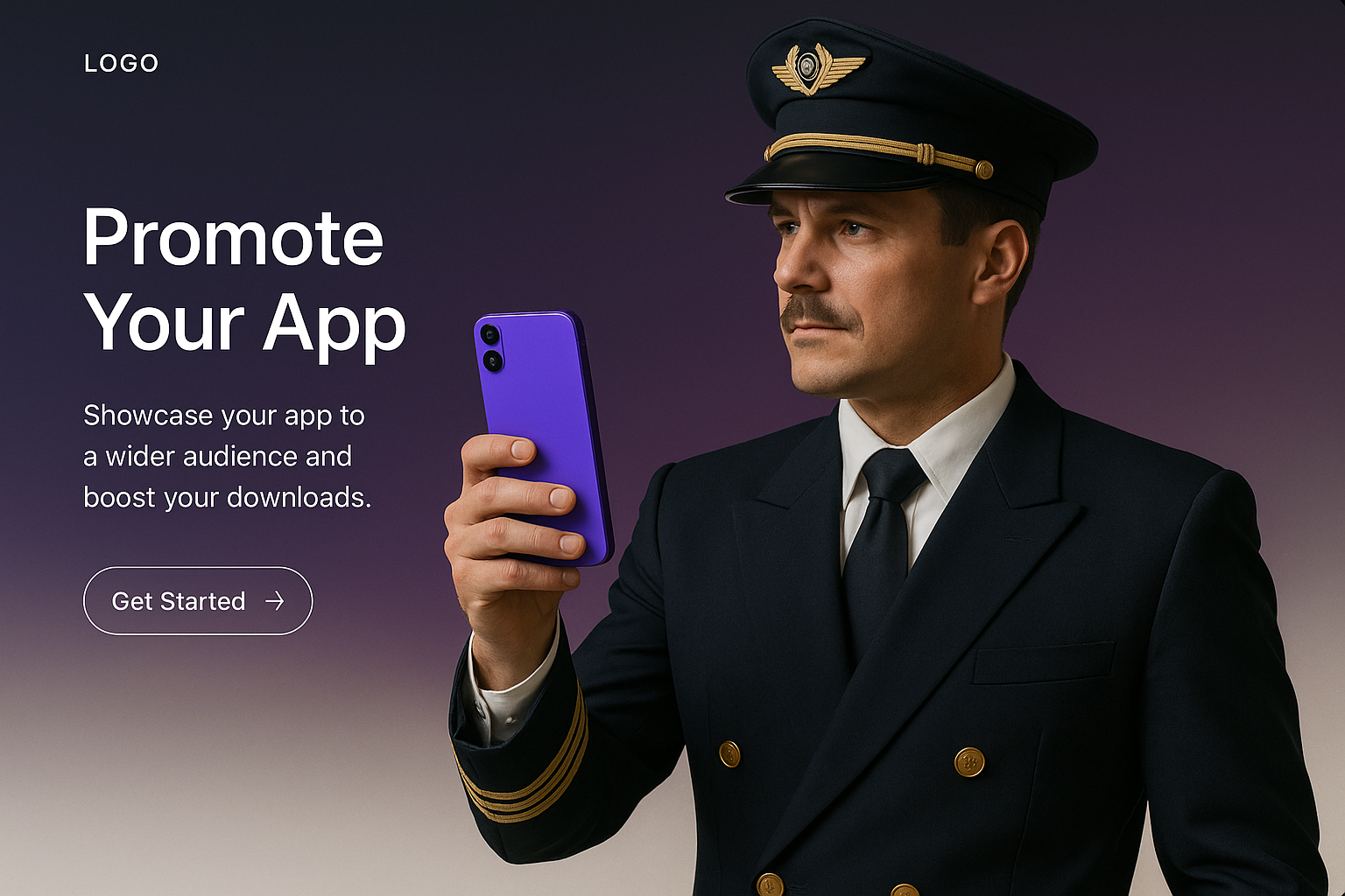 A pilot in uniform holds a purple phone, showcasing a modern aviation theme. The background features a gradient, enhancing the professional and stylish look.