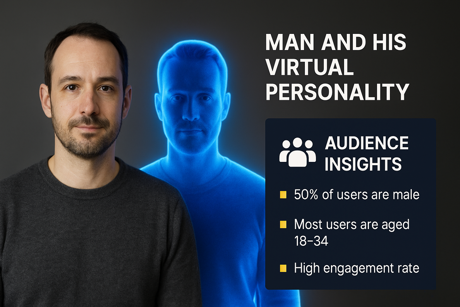 /Collection: /by davooda/Type: PNG/A modern graphic showcasing a man and his virtual counterpart, highlighting audience demographics and engagement metrics. Ideal for digital marketing discussions.