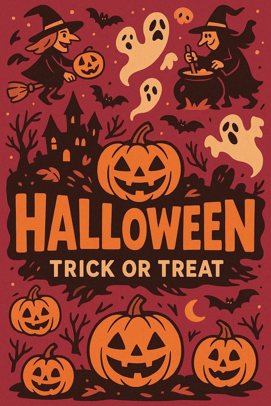 Festive Halloween Illustration Featuring Witches and Pumpkins
