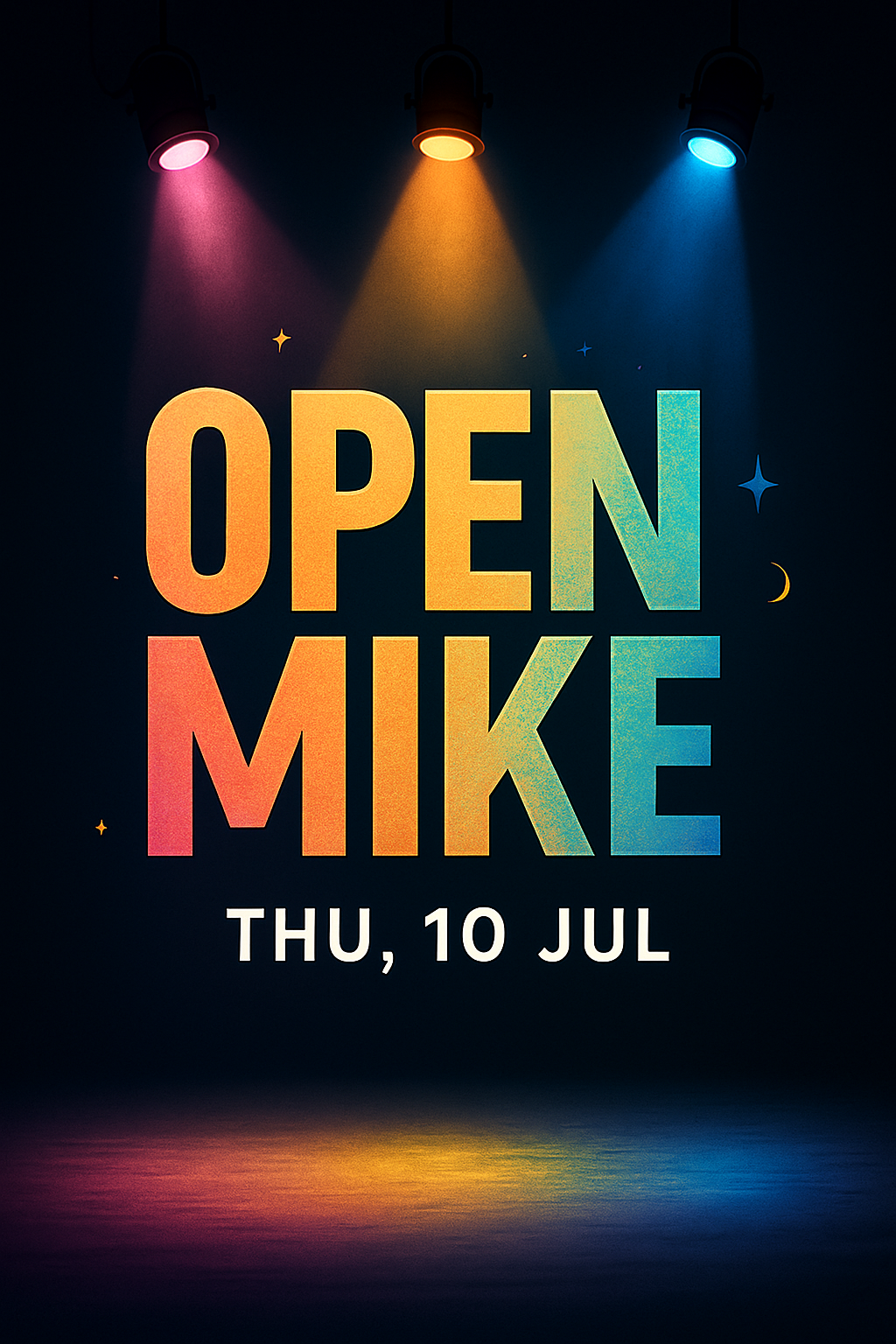 Vibrant promotional graphic for an open mic event, showcasing bold typography under colorful stage lights. Ideal for social media promotions or event flyers.