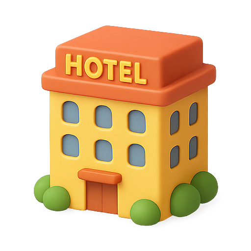 A playful 3D icon of a hotel building featuring a bright yellow facade, orange roof, and rounded green bushes, ideal for travel and hospitality applications.