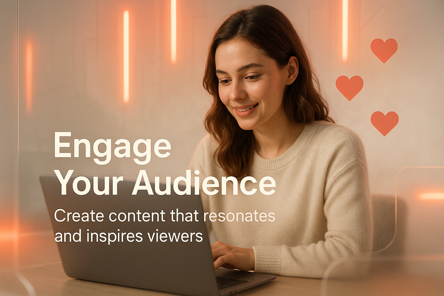 A modern visual promoting audience engagement through content creation, featuring a young woman working on a laptop in a cozy environment. Ideal for social media and marketing materials.