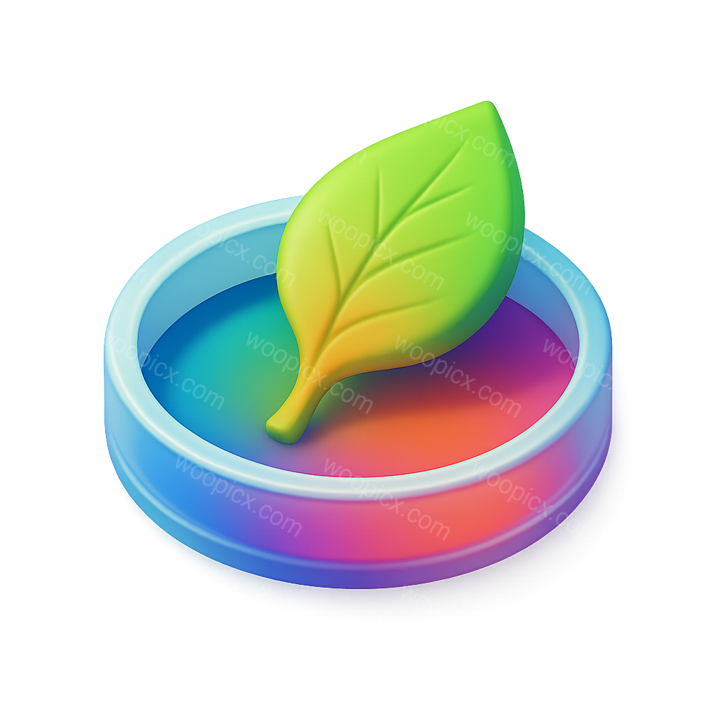 A striking 3D icon featuring a colorful circular base with a vibrant gradient and a prominent green leaf. The design showcases a modern and isometric style.
