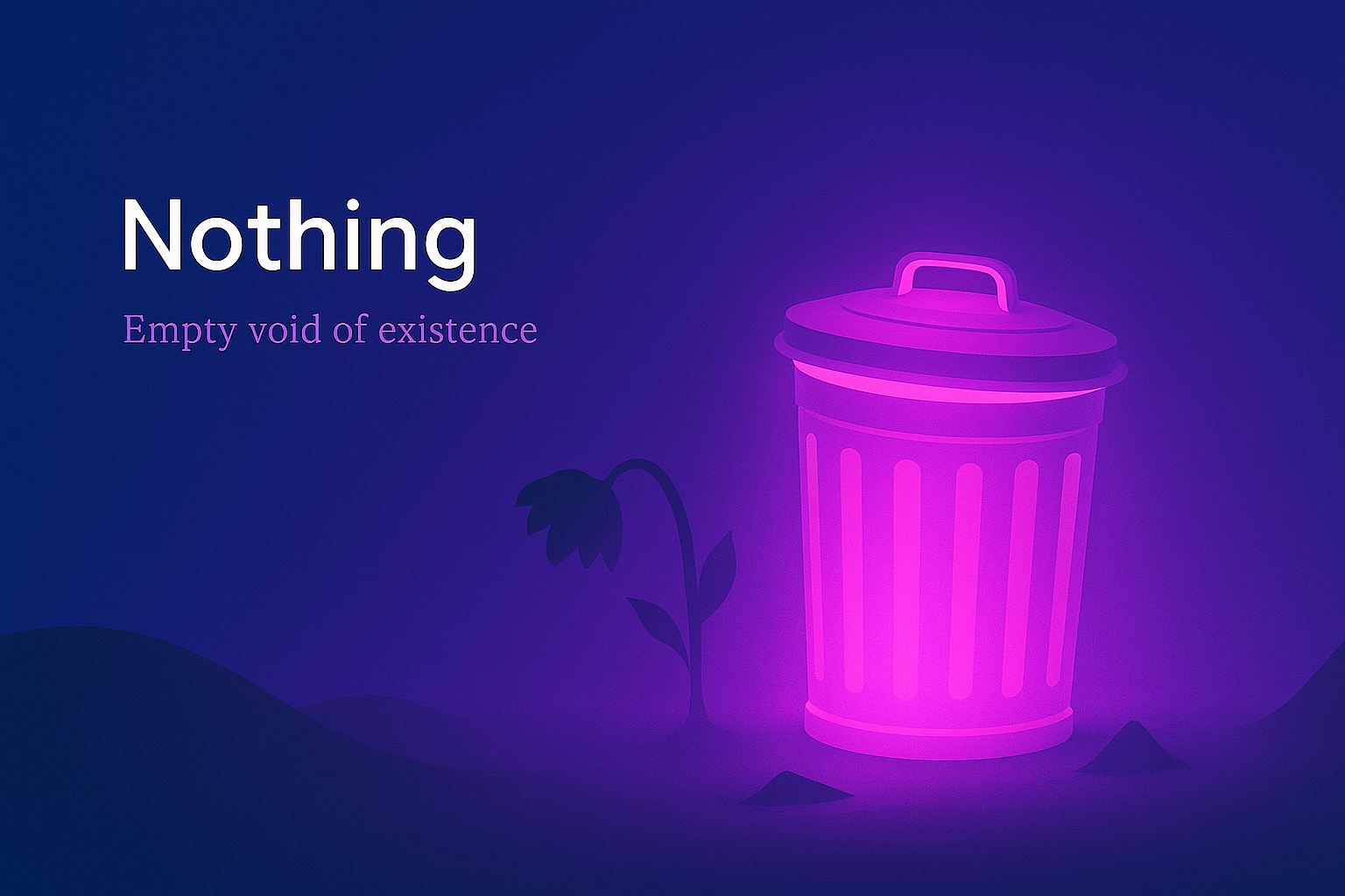A digital composition featuring a glowing neon pink trash can against a dark blue background. A wilted flower and subtle shadows enhance the theme of emptiness.