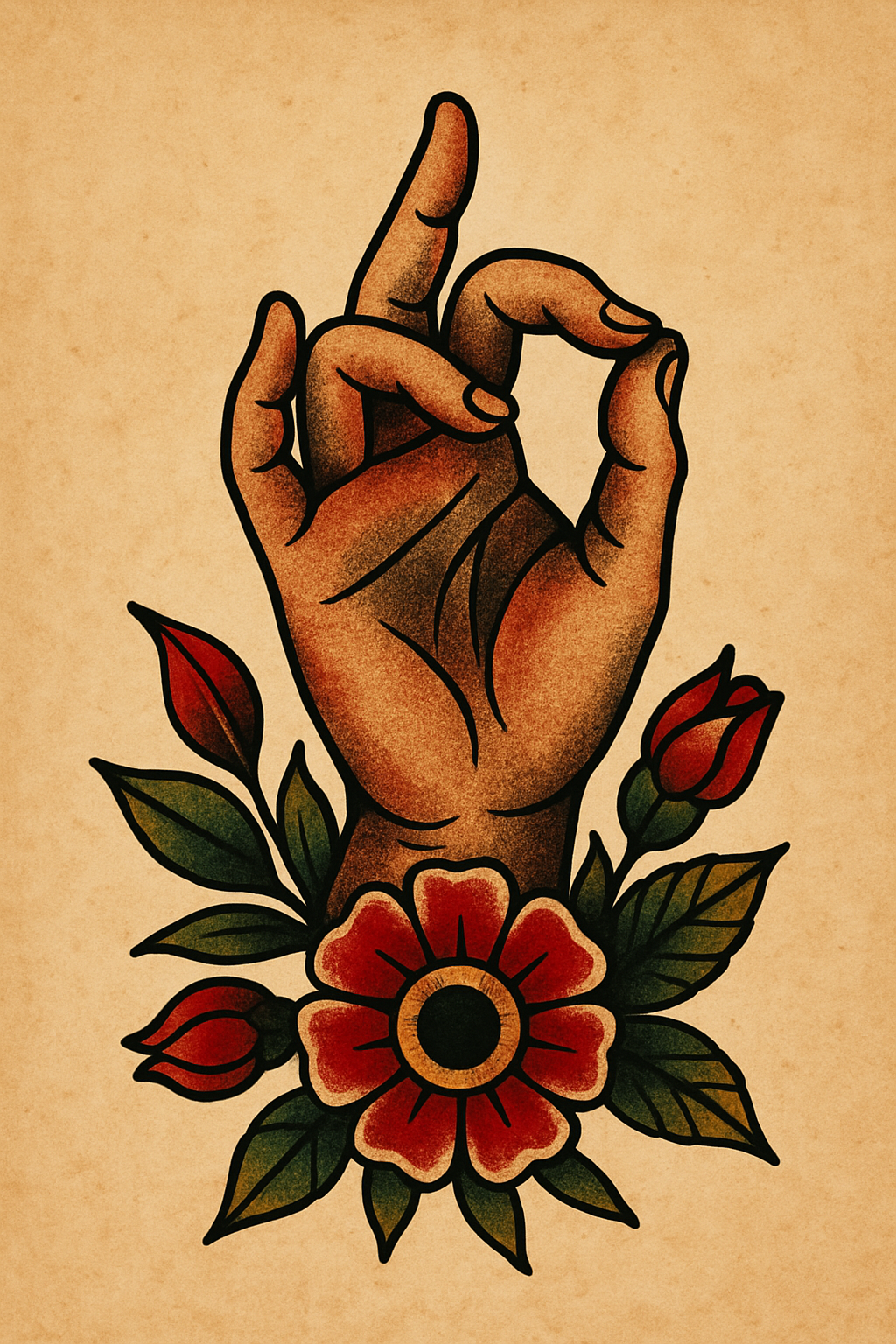 This image features a stylized hand making an 'OK' gesture, surrounded by vibrant flowers and leaves. It has a vintage aesthetic, ideal for tattoo art or illustrative designs.
