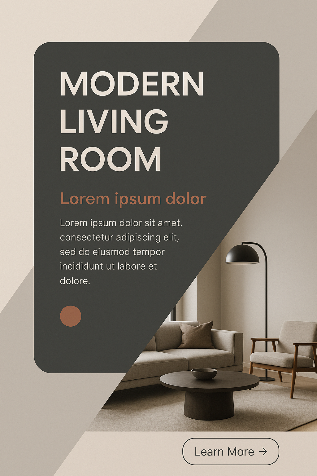 A contemporary living room featuring geometric shapes, a stylish lamp, and a cozy sofa. The design uses a three-color scheme with clear text hierarchy.